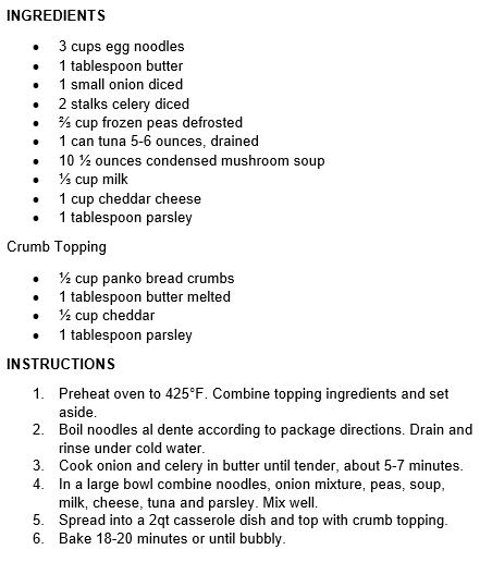 Classic recipe for tuna noodle casserole, a go-to favorite American dish. It's an easy recipe that you can use to make a tasty meal your ...This tuna casserole recipe isn't that one. While still incredibly simple to make — it's so, so much tastier. Plus, convenient to bake at a ...una Noodle Casserole from Scratch is a quick and easy recipe loaded with tuna, egg noodles, peas, and a creamy, cheesy, homemade white ..